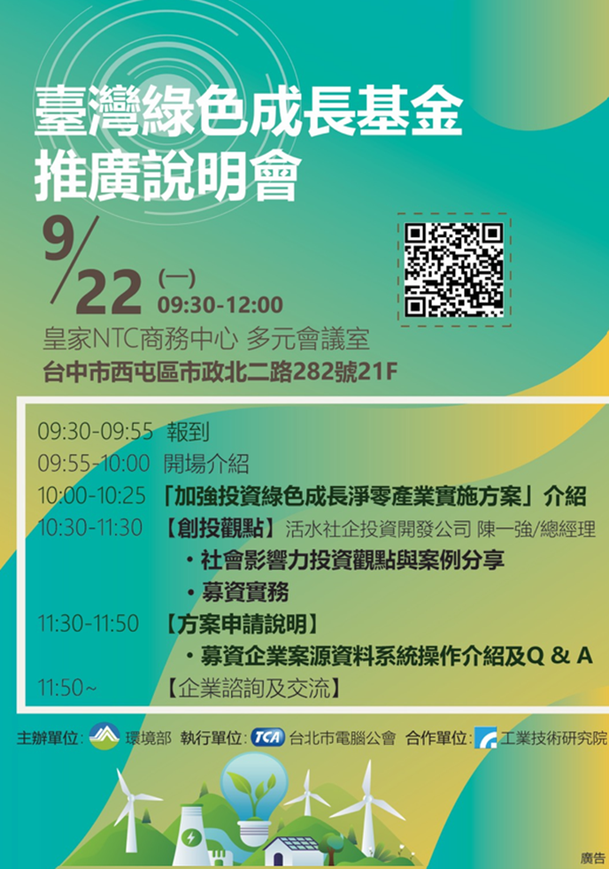 環境部為加速臺灣達成2050淨零轉型總體目標,正積極推動「加強投資綠色成長淨零產業實施方案」。本次推廣說明會會中深入介紹方案的投資機制,其核心精神是由政府擔任資金火車頭的角色,透過與民間搭配投資人共同合作,運用其專業評估與投後管理能力,共同投資具備淨零永續潛力之國內外企業。本方案涵蓋六大重點領域:包括資源循環新興產業;永續及前瞻能源技術發展、科技儲能新興產業;深度節能、提升能源效率新興產業;碳捕捉、負碳技術發展新興產業;數位、低(減)碳技術發展新興產業;氣候變遷調適技術發展新興產業。