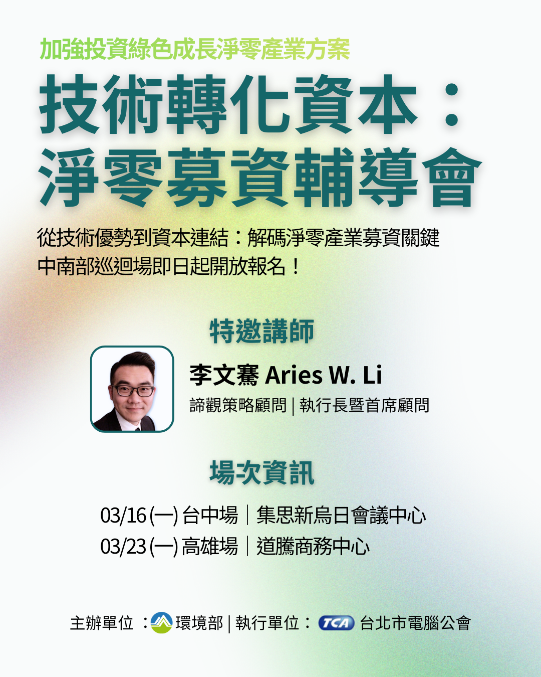 為了協助國內業者跨越募資門檻,將深奧的技術數據轉化為具備投資吸引力的商業敘事,本次規劃於三月中下旬,分別於台中與高雄辦理「技術轉化資本:淨零募資輔導會」。本次活動特別邀請具備資深募資實戰經驗的諦觀策略顧問李文騫執行長親自指導,帶領企業領袖精準解碼投資人的決策心法,並系統化拆解募資計畫書的關鍵架構。